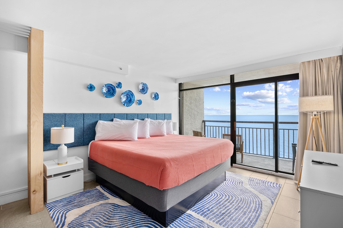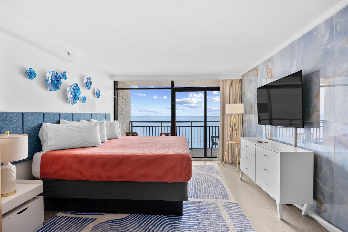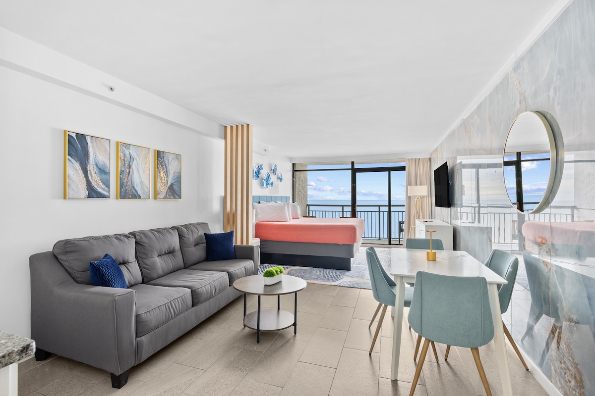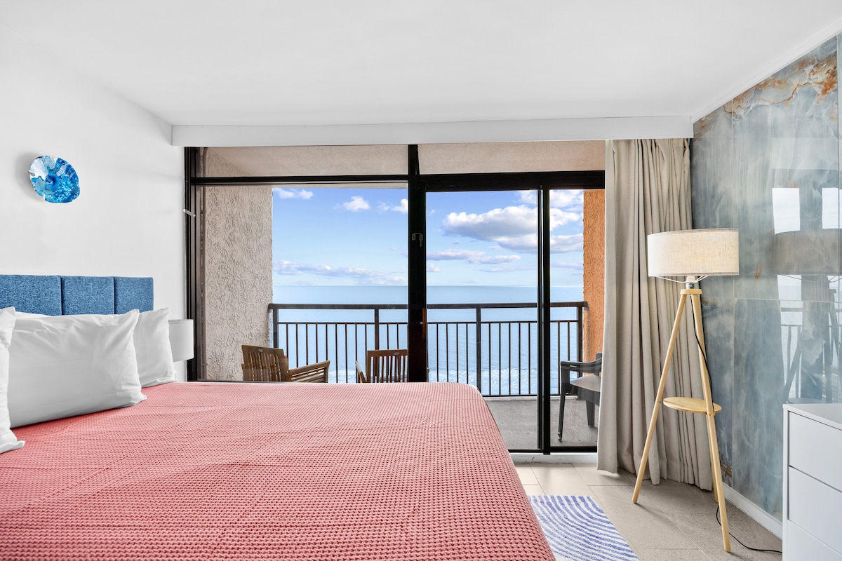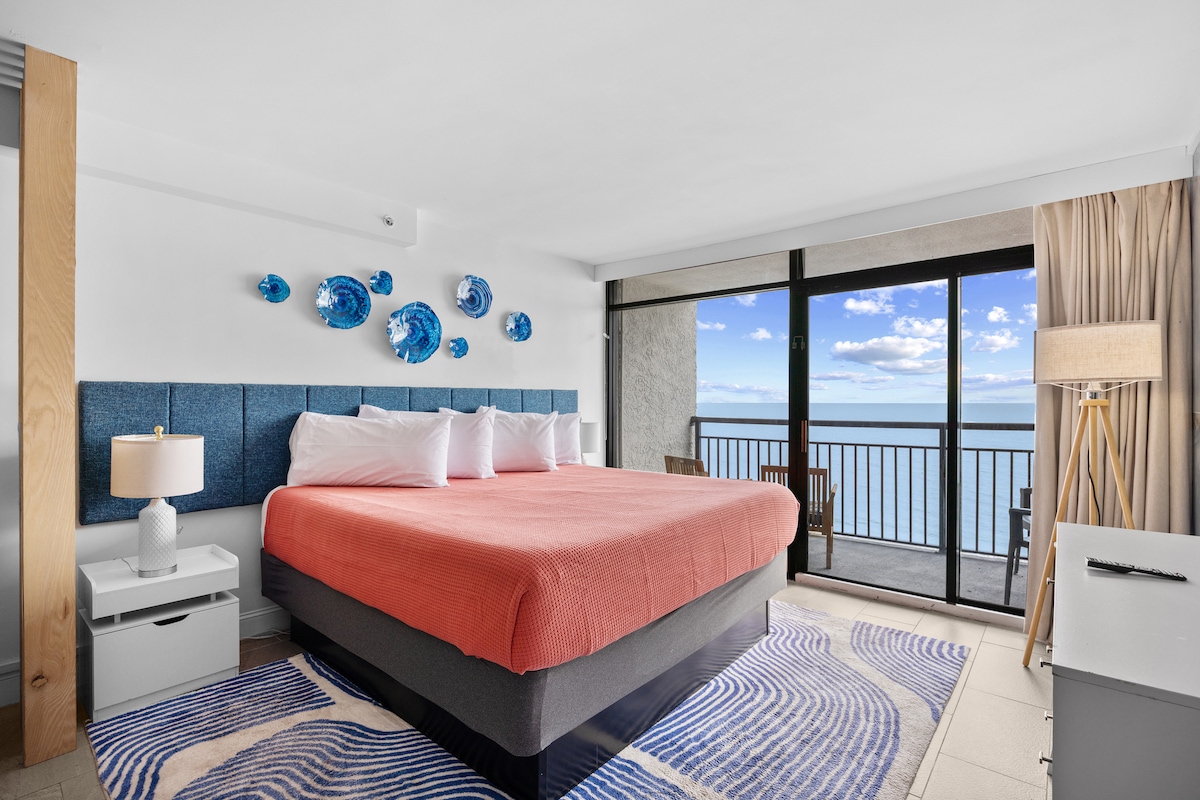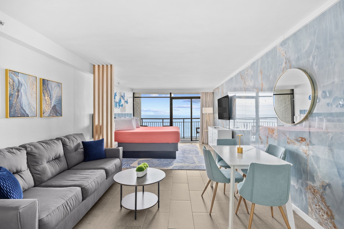 Myrtle BeachWake up each morning to magnificent sunrises without getting out of the king bed in this very modern feeling oceanfront, studio condo.