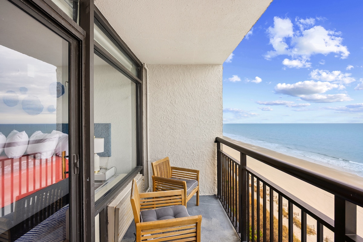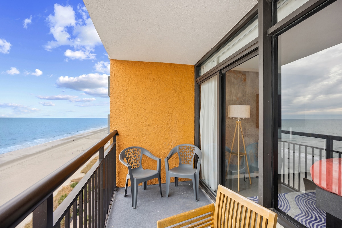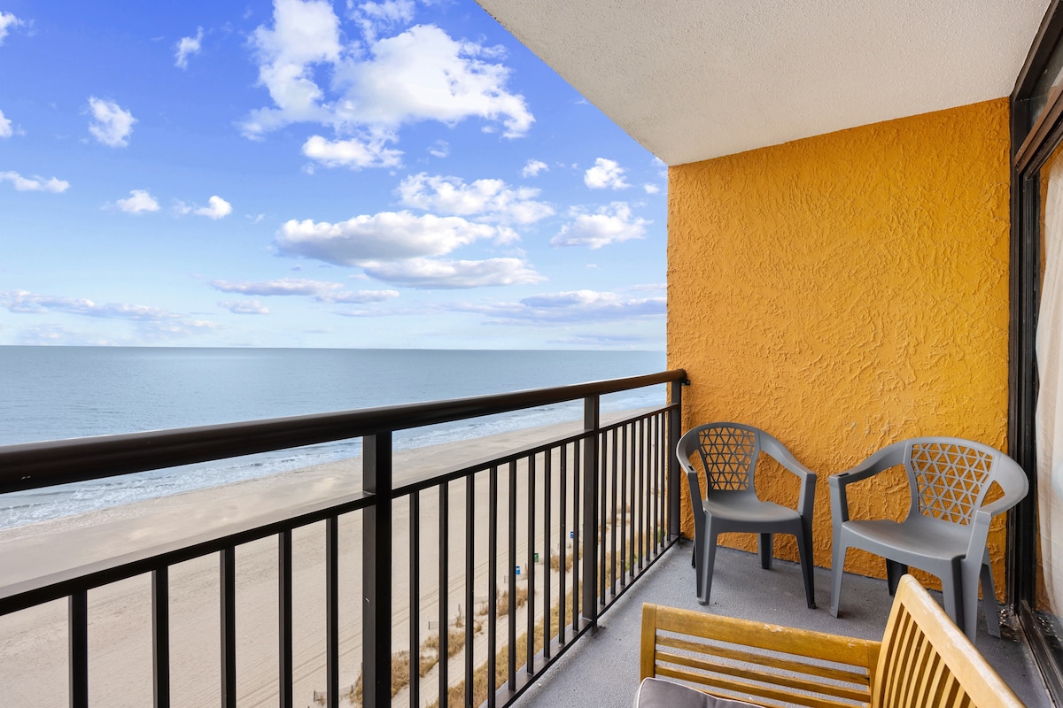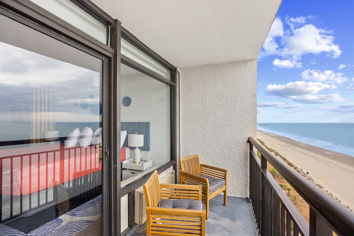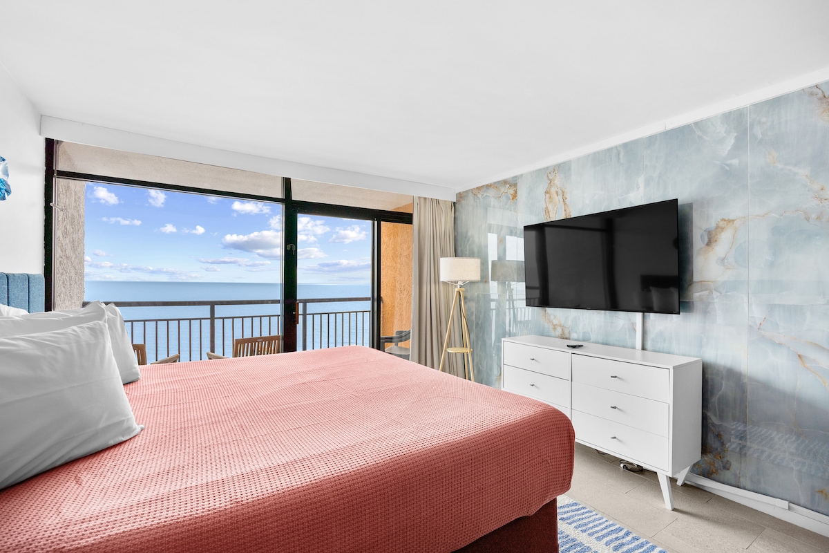 Myrtle BeachWake up each morning to magnificent sunrises without getting out of the king bed in this very modern feeling oceanfront, studio condo.