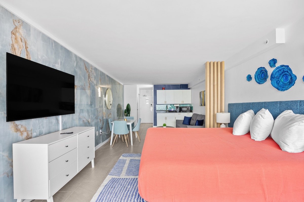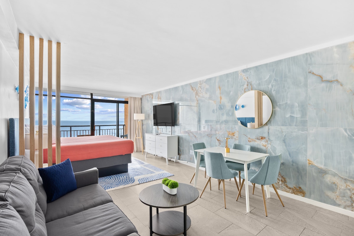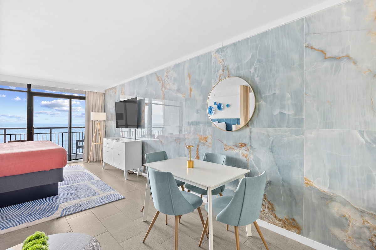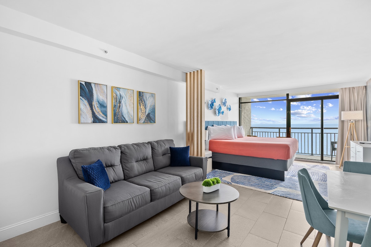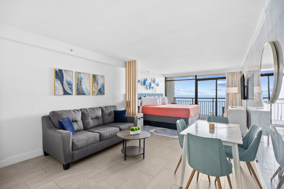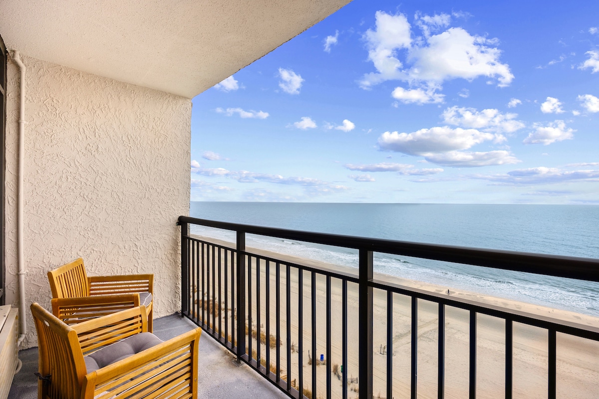Myrtle BeachWake up each morning to magnificent sunrises without getting out of the king bed in this very modern feeling oceanfront, studio condo.